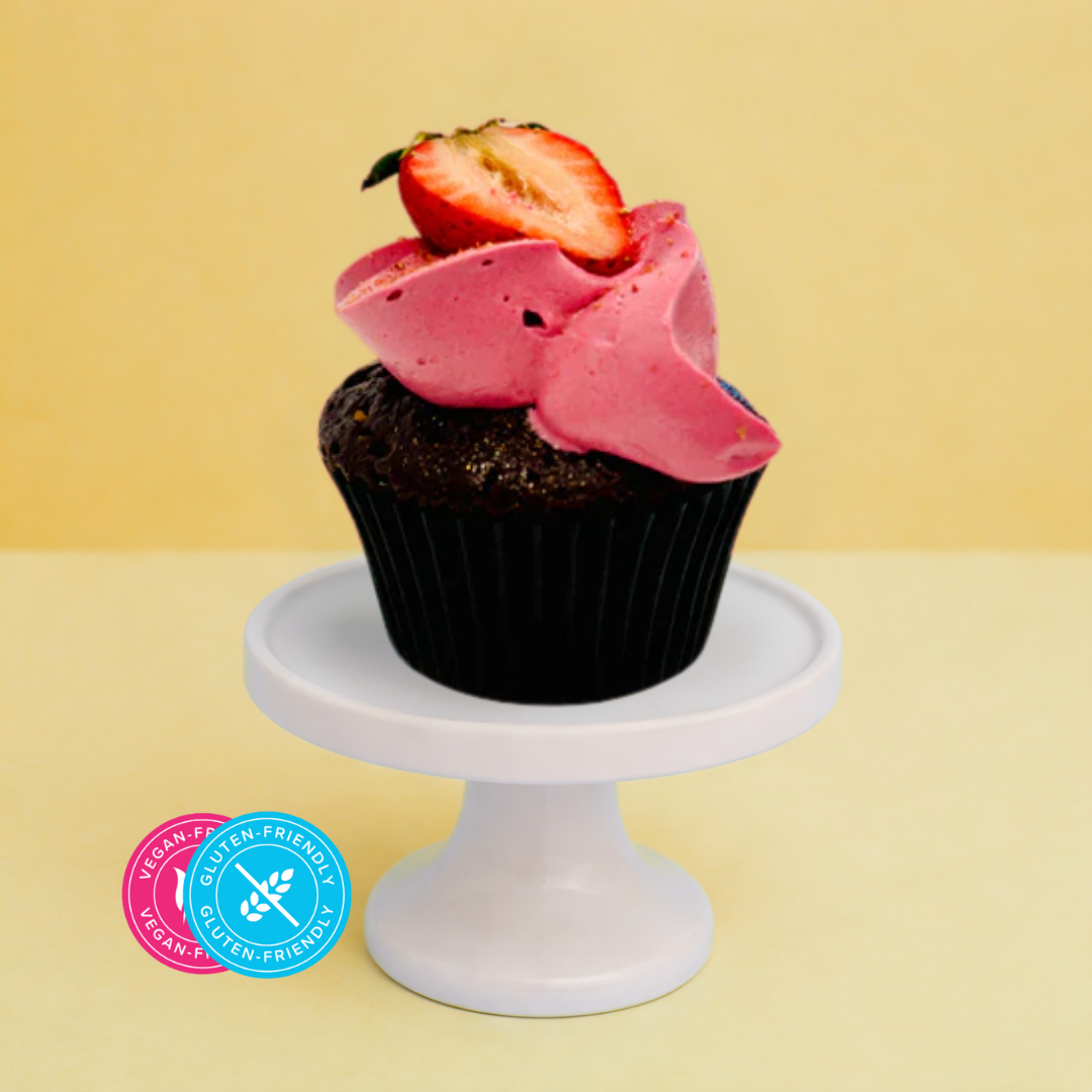 A little bit fruity, a whole lot fudgy. Our rich gluten-friendly vegan chocolate fudge cupcake is filled with house-made strawberry compote, then crowned with dreamy strawberry buttercream. The grand finale? A glossy chocolate-dipped strawberry for an extra-decadent finish.