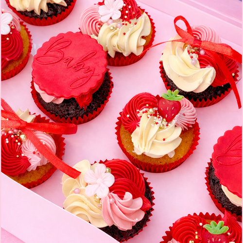 Each cupcake is finished with smooth buttercream swirls in blush pink, vanilla, and berry-red hues, decorated with strawberry toppers, delicate florals, gold pearls, and elegant ribbon accents. Featuring adorable “Baby” fondant plaques, this box is designed to impress at any baby shower or welcome-baby event.