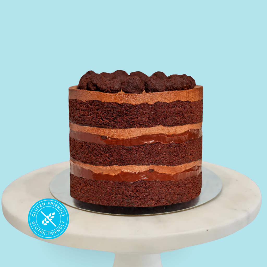 Towering layers of rich chocolate fudge cake, stacked with silky chocolate buttercream and decadent fudge ganache. This naked-edge beauty lets the chocolate do all the talking—finished with a crown milk chocolate buttercream and extra chocolate for the ultimate choc-on-choc moment.