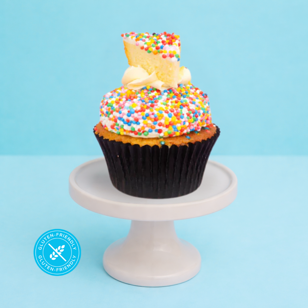 A childhood classic, reimagined the Sugar Rush way — gluten-friendly style. Our soft vanilla bean cupcake is crowned with a smooth swirl of vanilla buttercream, then dipped in colourful hundreds & thousands for that unmistakable fairy bread finish. The grand finale? A cheeky mini slice of fairy bread — because no Aussie party is ever complete without it.