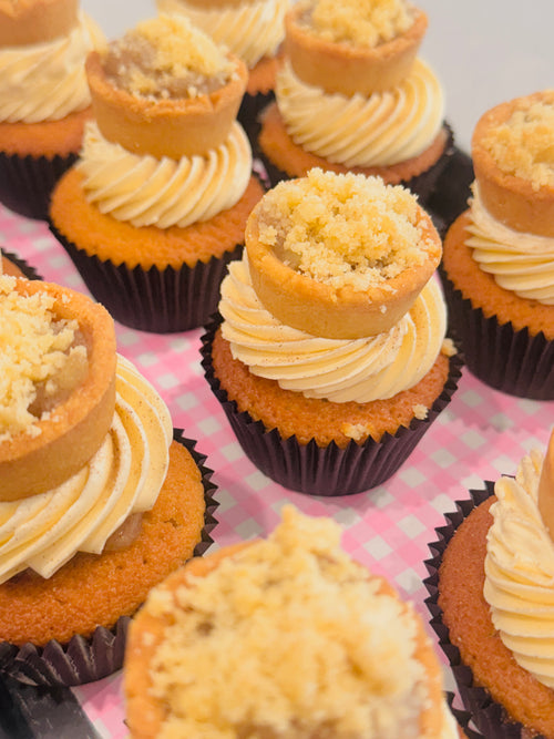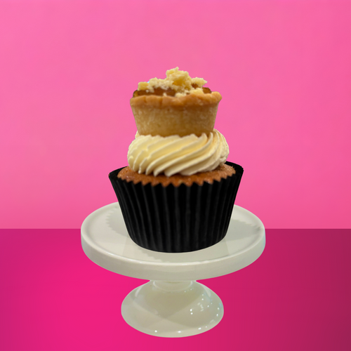 All the charm of Grandma’s apple pie, baked into a cupcake. This cosy creation features a spiced cinnamon sponge filled with sweet apple compote, topped with creamy cinnamon sugar buttercream, and finished with the cutest mini apple pie. It’s warm, nostalgic, and totally irresistible.