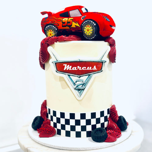 Buckle up—this Lightning McQueen cake is built for birthday thrills! Featuring a bold red finish, racing flags, a 3D McQueen topper, and customisable name and age in the iconic Cars logo, it’s the ultimate centrepiece for any little racer.