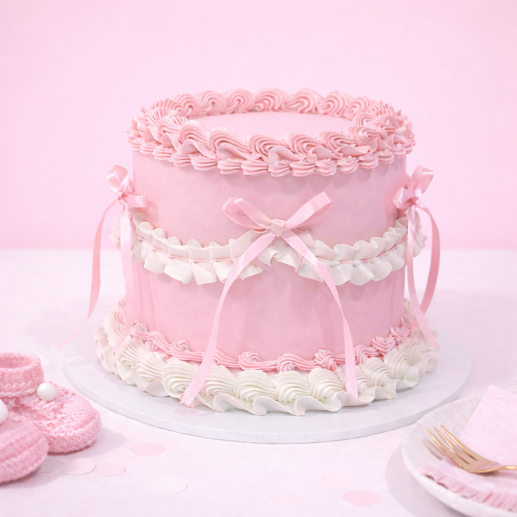 Our Pretty in Pink Cake is a vintage-inspired dream, featuring hand-piped ruffles, soft blush buttercream swirls, and the prettiest satin bows with flowing ribbon tails. Designed to feel timeless and feminine, she’s the perfect centrepiece for a beautiful baby shower.