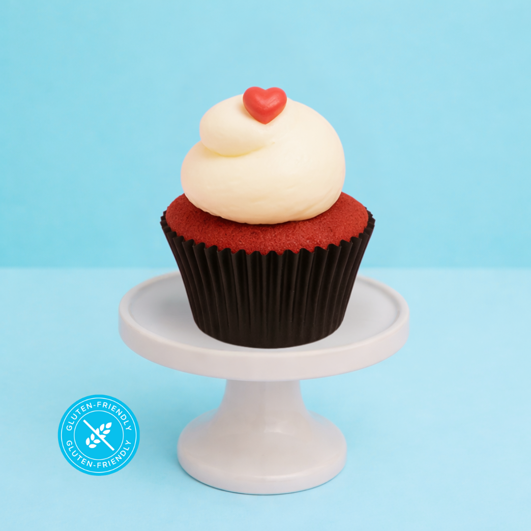 A timeless favourite, made gluten-friendly. Our moist, fluffy red buttermilk cupcake is delicately flavoured with premium Callebaut cocoa and fragrant vanilla bean, then crowned with a swirl of velvety cream cheese icing. The grand finale? A handmade mini red heart decoration — unmistakably Sugar Rush Bakery.