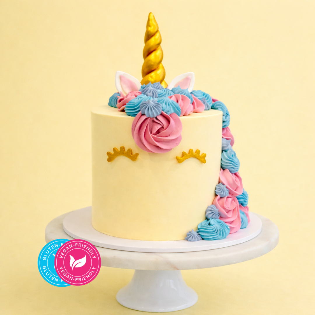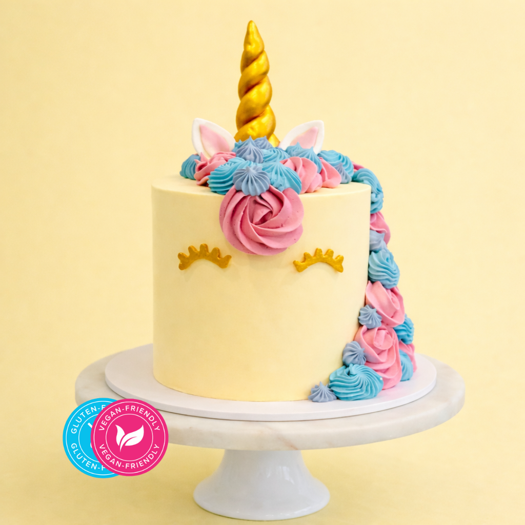 Beautifully crafted for inclusive celebrations, our Gluten-Friendly Vegan Unicorn Dream Cake delivers whimsy, style, and show-stopping charm. Soft swirls of pastel buttercream form a magical mane, finished with golden lashes, dainty ears, and a shimmering horn that steals the spotlight.