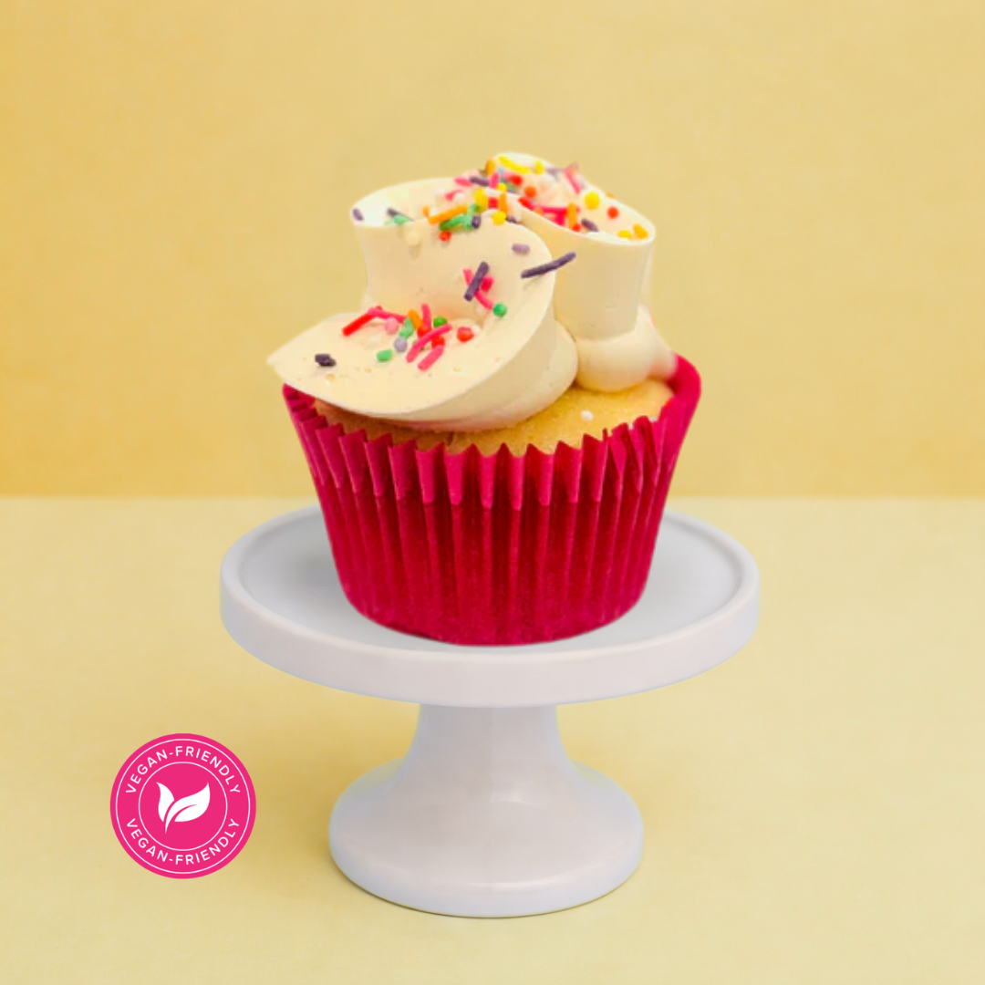 Throwing a party and not sure who’s vegan? These cupcakes are your go-to crowd-pleasers. Our Vegan Vanilla Party Cupcakes are soft, fluffy plant-based sponges made with Madagascan vanilla, topped with creamy dairy-free vanilla buttercream and a generous hit of rainbow sprinkles. So good, even the non-vegans will be fighting for one.