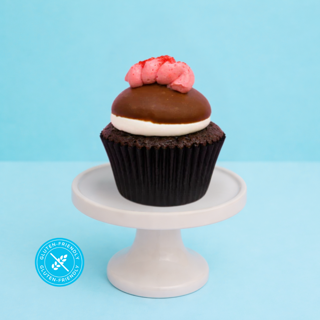 A lunchbox legend, turned into a cupcake. Our rich, fudgy chocolate mud cupcake is baked on a buttery vanilla shortbread base for that unmistakable Wagon Wheel crunch, then filled with a sweet strawberry jam centre. The grand finale? A fluffy choc-dipped meringue topper for the ultimate throwback bite.